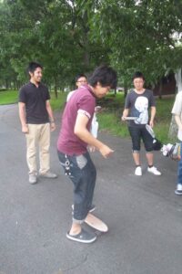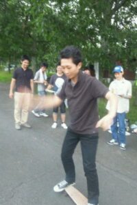 山の傾斜を利用してのスケボー遊び。
