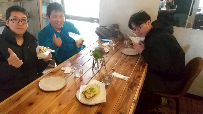 翌日は行けるメンバーで唐泊合宿所を見学およびその横のカフェの「波と丸」でおススメのギョロッケバーガーを頂きました♪