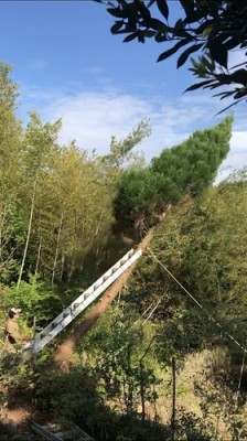 枝を切って根元を切り、綱引きで倒す。