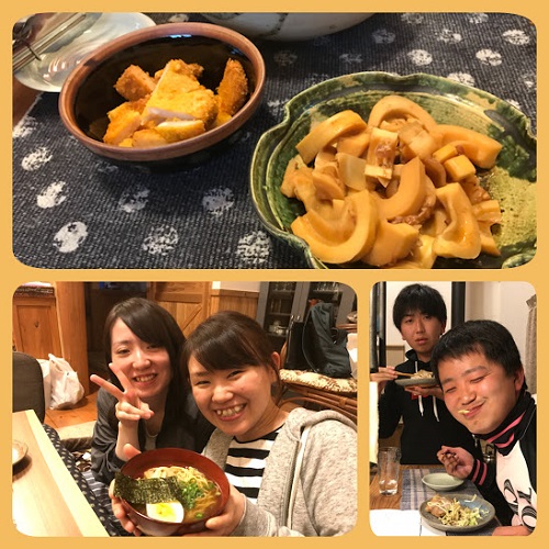 社長に作っていただいたたけのこの煮物や、〆のラーメンにも舌鼓。